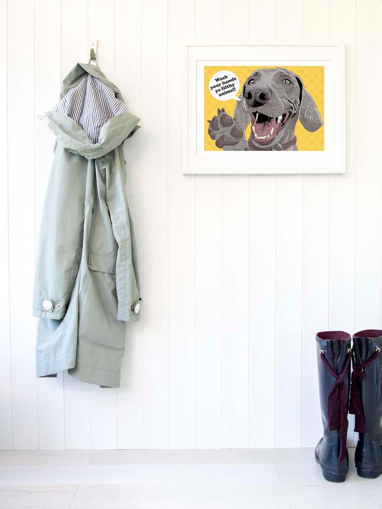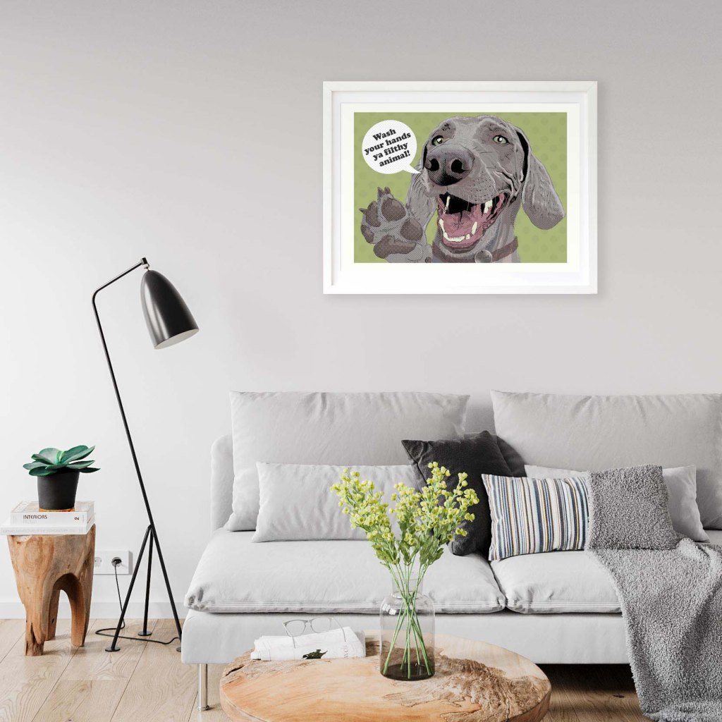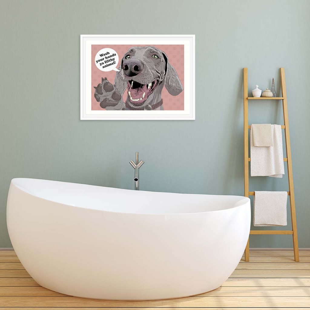 My Weimeraner print makes a fab personalised gift as I can customise the speech bubble text and the name on the dog tag for you. This Weimeraner wall art print looks fab as living room art, bathroom art and makes a fabulous pop of colour in any modern living or commerical spaces.